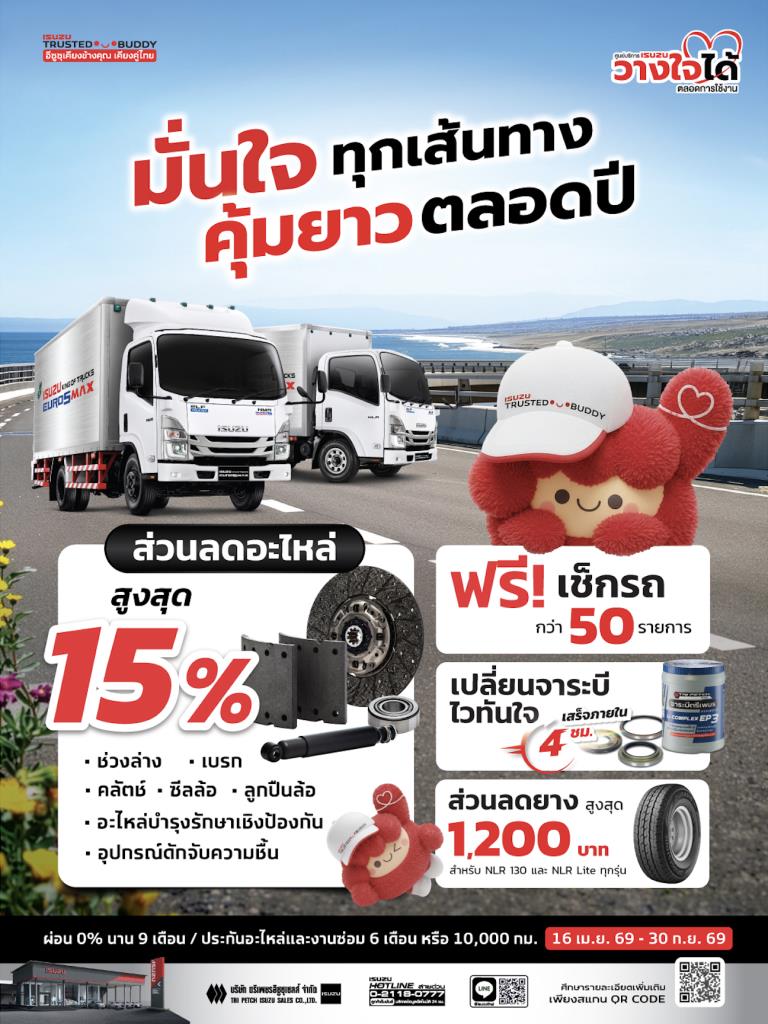 วิชัย สินอนันต์พัฒน์ รองกรรมการผู้จัดการ บริษัท ตรีเพชรอีซูซุเซลส์ จำกัด เชิญชวนเจ้าของรถอีซูซุเข้ารับบริการตรวจเช็กสภาพรถหลังการเดินทางไกล ณ ศูนย์บริการมาตรฐานอีซูซุทั่วประเทศ พร้อมมอบความคุ้มค่าผ่าน 2 แคมเปญหลัก ได้แก่ “ได้ทั้งลด ได้ทั้งคะแนน” สำหรับรถปิกอัพและรถยนต์นั่งอเนกประสงค์อีซูซุทุกรุ่น และ “มั่นใจทุกเส้นทาง คุ้มยาวตลอดปี” สำหรับรถบรรทุกอีซูซุขนาดใหญ่ (ตั้งแต่ 2 ตันขึ้นไปทุกรุ่น) โดยลูกค้าสามารถรับสิทธิประโยชน์ผ่านแอปพลิเคชัน my-ISUZU ครบจบในที่เดียว ทั้งด้านความประหยัดและการดูแลรถยนต์ ระหว่างวันที่ 16 เมษายน 2569 ถึง 30 กันยายน 2569