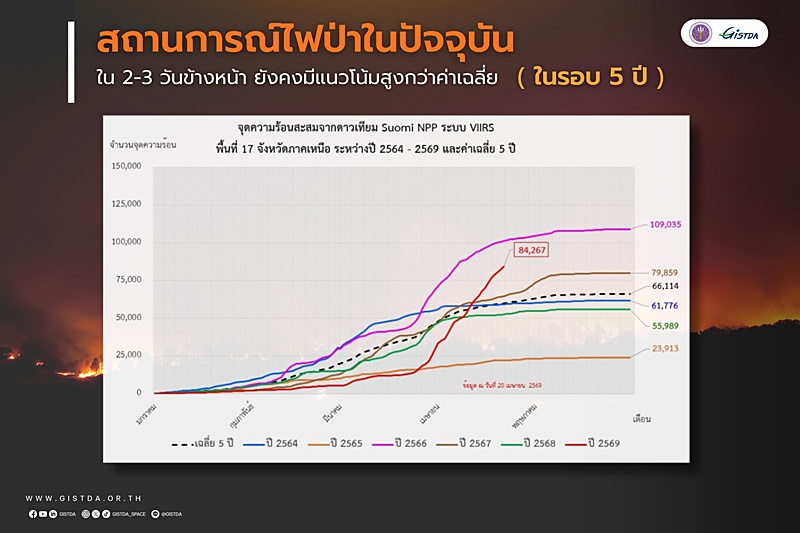 GISTDA สำนักงานพัฒนาเทคโนโลยีอวกาศและภูมิสารสนเทศ (องค์การมหาชน) เผยสถานการณ์ไฟป่าในปัจจุบันจากกราฟจุดความร้อน พบว่าในห้วง 2-3 วันข้างหน้า ยังคงมีแนวโน้มสูงกว่าค่าเฉลี่ยในรอบ 5 ปี