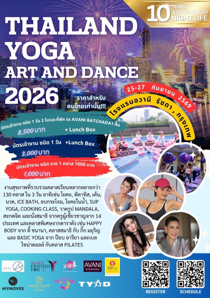 มาดูแลสุขภาพกันกับคลาสออกกำลังกาย ทั้งกาย และใจ ในงาน TYAD ครบรอบ 10 ปี ที่จะจัดขึ้นในวันที่ 25-27 กย 2569 ที่ รร อวานี รัชดา งานนี้รวบรวมครูดังกว่า 60 ท่าน 14 ประเทศ มาสอนในงาน เช่น เยอรมัน อเมริกา อินเดีย จีน ไต้หวัน สิงค์โปร์ มาเลเซีย เวียดนาม ฮ่องกง เกาหลี ญี่ปุ่น รัสเซีย ลาว และไทย คลาสกว่า 130 คลาส 12 ห้องเรียนทั้งบนบก และในสระว่ายน้ำ มีทั้งคลาสโยคะ คลาสเต้น พีราทิส ซุมบ้า อีกทั้งคลาสแนว บำบัดต่างๆ เช่น คลาสสะกดจิต วาดรูปแมนดารา ice bath อบกระโจมสมุนไพรไทย Sound healting cooking class Thai Massage ตอกเส้น โดยแพทย์แผนไทย และคลาสกัวซาบำบัดโดยแพทย์แผนจีน ภายในงานมีบูธเปิดให้ผู้มาร่วมงานได้ใช้บริการฟรี อาทิเช่น บูธแมะตรวจสุขภาพแนวแพทย์แผนจีน บูธตรวจปอด ตรวจกล้ามเนื้อไขมัน ตรวจเลือดด้วยเครื่อง ABI เทคโนโลยีใหม่ บูธจักรยานน้ำผลไม้ปั่น รวมถึงบูธขายสินค้าสุขภาพ บริการต่างๆ เช่น เสื้อผ้าออกกำลังกายต่างๆ อุปกรณ์โยคะภายในงาน บูธนวดเท้า นวดไทย อาหาร และเครื่องดื่มสุขภาพ งานนี้ครูผู้สอนนำขบวนโดยดาราไทยสายรักสุขภาพ อาทิเช่น ดี้ชนานา สอนคลาส Happy body, กิ๊ก มยุริญ กับคลาสสมาธิ, ป๊อป อารียากับคลาส Back to basic เบล ไชน่าดอลล์กับคลาส พีราทิส แมท ราคาพิเศษสำหรับคนไทยเท่านั้น 8,500 ่บาท ได้บัตรเข้างานชนิด 1 วัน แบบเล่นไม่จำกัด จำนวน 2 ใบ พร้อมที่พัก โรงแรมอวานี รัชดา รวมอาหารเช้า 1 คืน สำหรับ 2 ท่าน หรือเฉพาะบัตรไม่รวมที่พัก ชนิดราย 1 วัน ราคา 3000 บาท, ราย 1คลาส ราคา 1000 บาท ติดต่อซื้อบัตรได้ที่ line@makefriends.foru, Tel. 099-0843020 ,090-6573020 , more info:www.makefriendsforu.com
